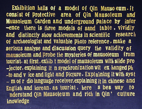 An important lesson to learn from looking at type such as this is that perfection can be boring. To my eye, a lot of today’s typefaces are clinically perfect but cold and stolid on the page. The irregularities that once arose from hand-cutting type have been ironed out in the digital era, resulting in type that’s less animated, less energetic on the page, than type set by hand. The following sign, from Xian, China, while fun to read, is interesting mainly for the choreography of the type, which is made up of raised, stick-on letters, some of which have fallen off.