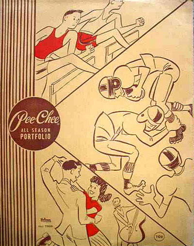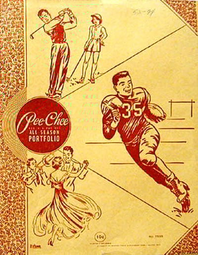 By1964, Mead Paper had bought Western Tablet and introduced new artwork to the Pee Chee line. These images of tennis players, football heroes, track stars, and dancers were drawn by Francis Golden, who received only a one-time fee for pictures that would grace millions of folders each year. Golden later became a prominent water colorist, and over the years new artists took over illustrating Pee Chee folder updates. According to Mead, the style of art was updated approximately every ten years.