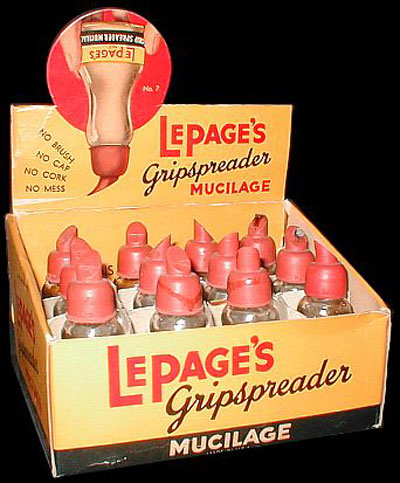 Back in my school days we didn’t have any fancy glue sticks or double-stick tape. We had paste and something called mucilage, which looked exactly like it sounds. The popular brand was LePage’s, and it came in a distinctive glass bottle with a strange rubber top with a slit in it. Mucilage is any gummy substance made from vegetable oils, though from what I can gather, the early stuff from LePage’s was made from fish scales.