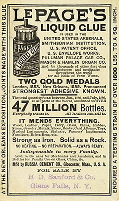 William Nelson Le Page is known as Canada’s “glue czar,” for building a huge empire in the paste business. In the 1870s Le Page discovered a way to turn codfish scales into industrial glue, and the rest is history. School children have been using LePage’s glue or that made by Borden ever since. And since there was always at least one student who had a fondness for eating glue, it was, and still is, reassuring to parents and teachers that most glues are non-toxic.