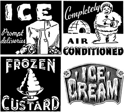 Four examples of early advertising art for things cold and icy.