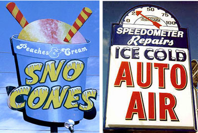 A Sno-Cone shop sign from the Web site roadsidephotos.com., and a Dayton, Ohio auto repair shop.