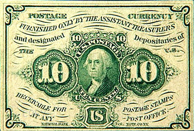 Figure 10: The smallest bill produced in the US was a 5 cent note, and the largest was a 100,000 bill with Woodrow Wilson on the face. Here is an early 10-cent note with Washington’s image.