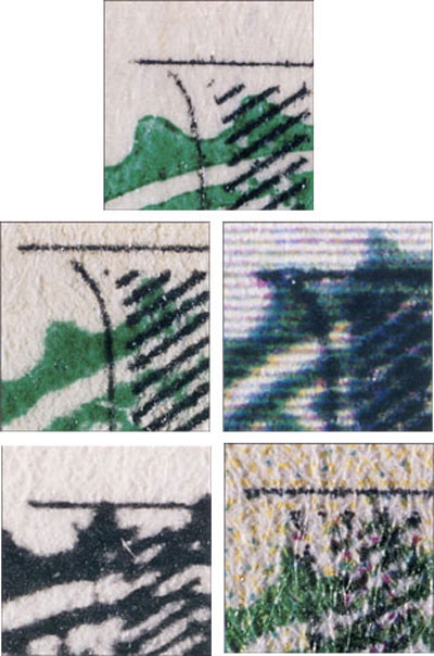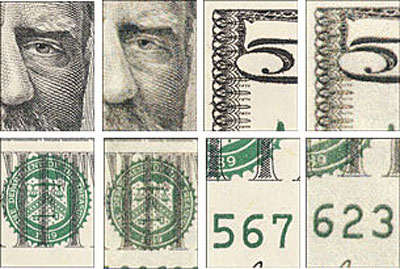 Figure 3: All sorts of reproduction is used for counterfeiting. Here, also from the Secret Service Web site, an authentic currency enlargement (top) and bogus bills printed by (from left to right) monochrome, inkjet, black and white, four-color.
