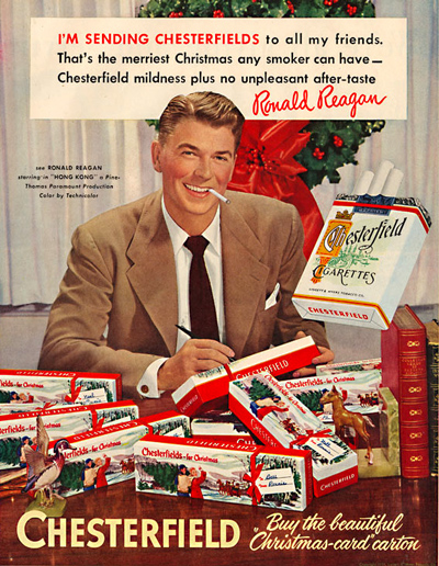 Cigarettes as Christmas gifts were promoted heavily throughout the 1950s and 1960s, here hawked by former president Ronald Reagan. While today we laugh at the idea of a movie star giving cigarettes as gifts, more subtle ads are still allowed in print.