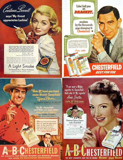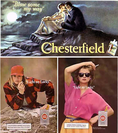 This early Chesterfield ad from 1926 [top] dared not show a woman actually smoking, but rather enjoying the pleasure of second-hand smoke. By the time the Lucky Strike ads on the bottom ran, however, women had gained full smoking rights, and every effort was made to picture smoking as a sexual attraction.