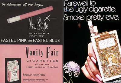 At several times attempts were made to make cigarettes more attractive. Vanity Fair inrtoduced pastel colors [left], and the brand Eve featured arty prints on the filters [right].