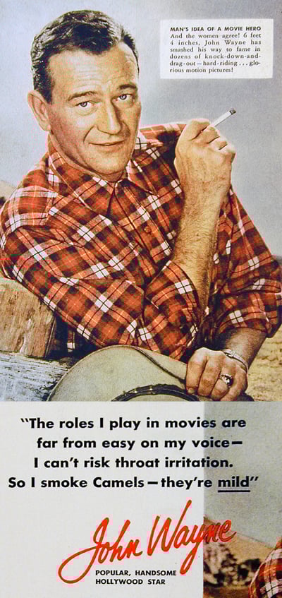In 1951, manly John Wayne was promoting the mild nature of Camel cigarettes. Before he eventually died of lung cancer, Wayne went back on the television airwaves on behalf of the American Cancer society to put in a good word for quitting.