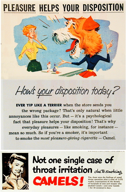 In 1956, cigarette companies were still promoting smoking as a remedy to tense nerves and as a way to avoid “yipping like a terrier,” as in this ad for Camels. Because of FTC rules regulating the direct claim of medical benefits, Camel made the indirect link between smoking pleasure and a more pleasing disposition. Below, Camel’s famous T-Zone philosophy, which held that Camels, “and only Camels” caused no throat irritation even after 30 days!