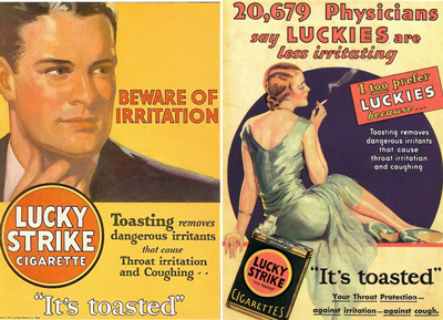 Before regulations prevented it, many cigarette companies spoke openly about the medical advantages of their brand. Here, in early Luck Strike ads, the benefits of “toasted” tobacco are hyped. Also, one of the first references to the famous Lucky slogan to “reach for a Lucky instead of a sweet.” That campaign is credited with bringing a large number of women to the ranks of smoking.