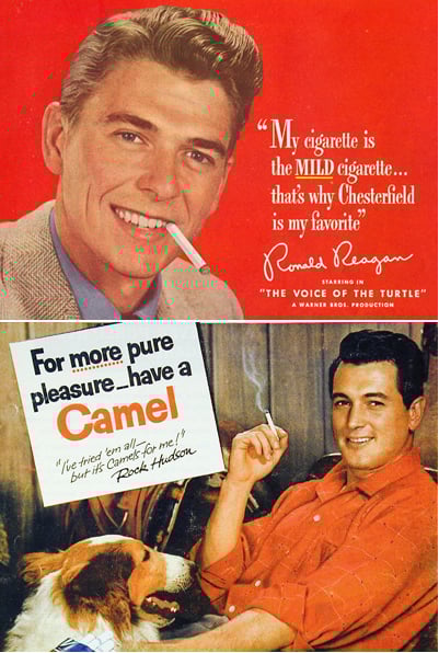 Everyone got in on the cigarette endorsement act, include a young Ronald Reagan (above) and Rock Hudson, below. By 1930, the FTC had already prohibited tobacco companies from using endorsement ads from people who had not actually used the product, so these two were the real thing.