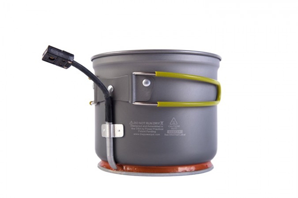 Juice up your iPhone in the backcountry! Use your fuel source of choice to boil water in this small cooking pot which, in turn, provides 5 watts of charging power.