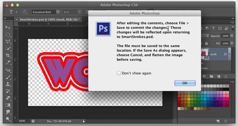 Photoshop then displays a message that tells you to choose File > Save after you make your edits to the contents of the Smart Object, and to save the edited file in the same location.