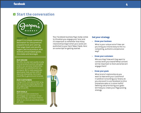Each section includes tips and tricks on such topics as best practices for posting and how to get fans involved with your Facebook page. Those of you who are more experienced in social-media marketing may find most value in the list of additional resources at the end of the guide. I’ve included that list and live URLs below.