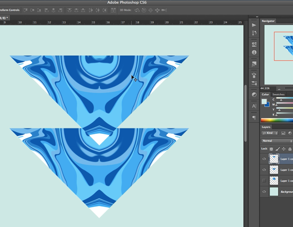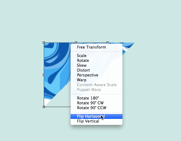 Now this is where the fun begins. Copy the triangle by right clicking the layer it’s on and selecting Duplicate Layer from the menu. With this new layer selected, go to Edit > Free Transform (at this point you might want to adopt that Ctrl+T shortcut, as you’ll be using this tool repeatedly). Right click the triangle and select Flip Horizontal.