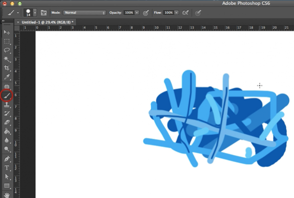 Using the Brush Tool draw a random scribble. At this point your art skills really don’t matter; just make sure you’re using a few different colours (or shades of one like I’m using here) and vary the brush thickness. If you’re feeling especially inspired, you can even combine different brushes and hardness options for added texture.