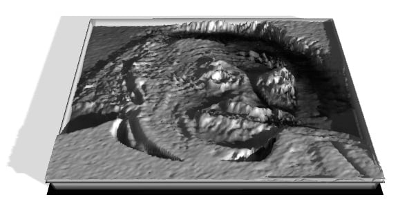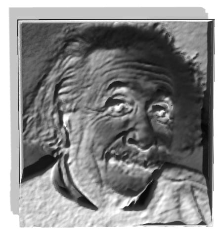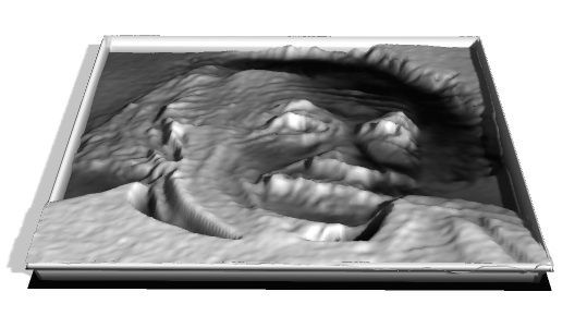 Open your Actions panel (Window menu) and you’ll find the new lithopane action listed at the bottom, in a folder named Make Lithopane. Select the Action and click the Play button at the bottom of the panel, and Photoshop will automatically run through the 33-step routine required to turn the flat image into a lumpy 3D object. Here’s the initial result, lit from the side so you can see the resulting contours:
