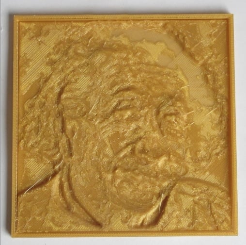When the lithopane is viewed head on, you can just about make out Einstein’s features. It looks rather odd, because of the way the procedure works: dark areas are made of thick plastic, light areas are thinner, so that they let more light through. In this sense, the image is inverted when seen from the top – and, indeed, one of the first steps of the Action is to invert the image: