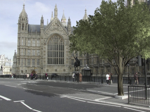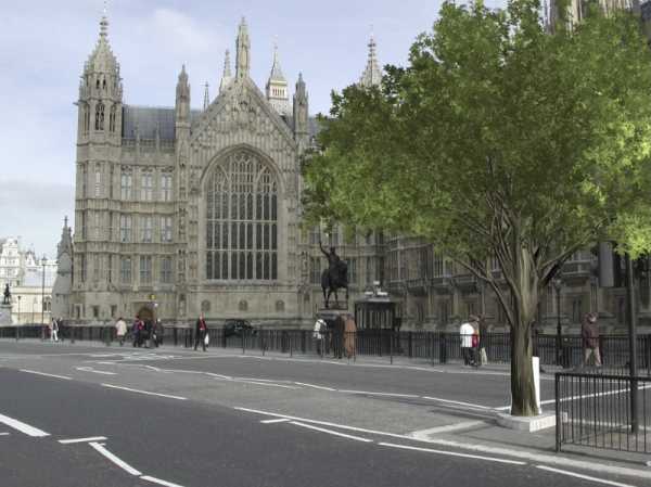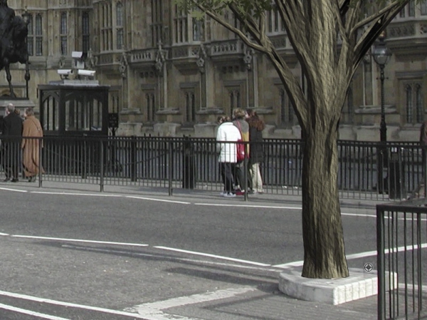 Here’s the completed image. With the shadow in place, with the new bark and toned-down leaves, the trees look far more like they could be a real part of this view; and bringing the traffic light to the front does the job of fixing the main tree more firmly into the scene.