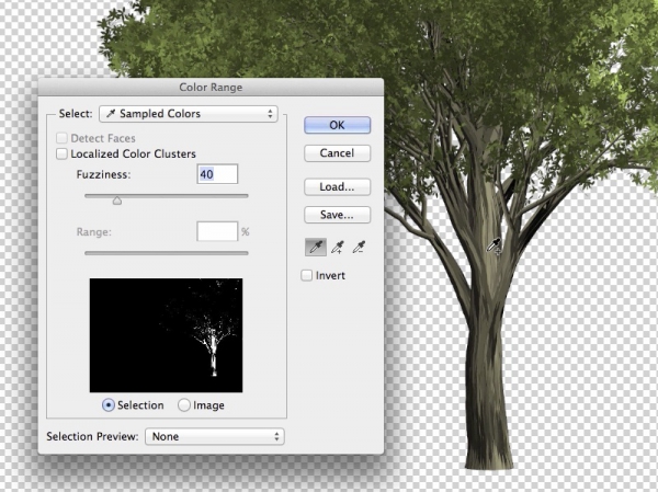 Hide the background layer so that just the tree is visible, and open the Select > Color Range dialog box. Click on the trunk of the tree, and you’ll see the selection area shown in white on the thumbnail. Hold the Shift key and drag over the trunk until all the bark color is selected. Hit OK, then choose Layer > New > Layer via Copy to make a new layer from the selection.