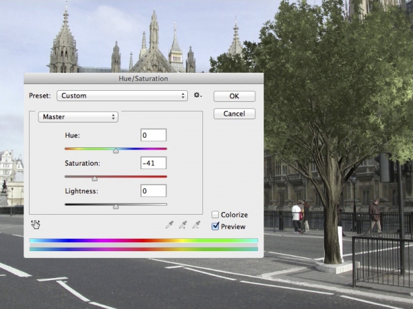 The leaves on our tree are far too brightly lit for this shady scene out of direct sunlight. While it would be possible to change the color when generating the tree, it’s a lot easier to open Adjustments > Hue/Saturation, and then drag the Saturation slider to the left.