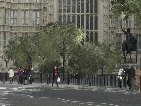 While you’re at it, why not plant a few more trees, using exactly the same technique as before. Here, I’ve added a selection of trees, and masked them so that they appear behind the railings. As we’ve done here, I’ve also desaturated all the trees so that they don’t jump out of the scene.