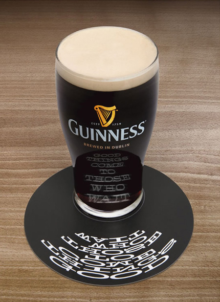 Kay and Corps are no strangers to unique typographic and visual solutions. In 2005, Guinness revived its “Good Things Come To Those Who Wait” tagline. To reintroduce the slogan to Guinness drinkers in the trenches, Kay and Corps worked with creative director Paul Brazier to develop a promotional piece. They designed a typographic coaster featuring seemingly meaningless curved lettering reversed out of a black background. Once the dark stout was poured into a glass placed on the special coaster, the message became clear to the Guinness drinker (Figure 4).
