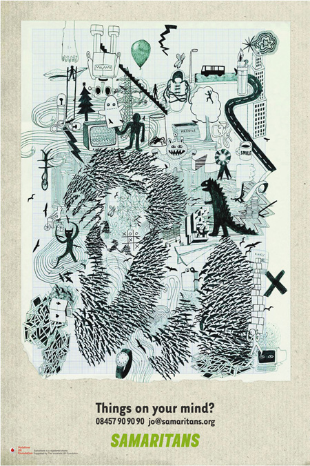 Figure 5. Lunar BBDO’s Winter Campaign 2006-2007 for the non-profit Samaritans organization. The doodle concept was chosen by members of the campaign’s target audience — young people. Creative direction by Ben Kay (copywriter) and Daryl Corps (art director). Click on the image for a larger version.