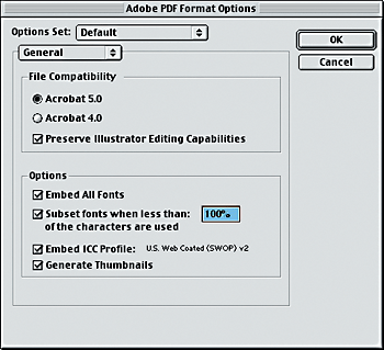 The settings in the Options section require a little more thought, but only a little. The first setting is Embed All Fonts, which is enabled for both the Default and Screen Optimized settings. Even though this makes your file sizes larger, you want to leave this option enabled if the appearance of your document is critical. If you don’t choose to embed fonts, the PDF document will look just the same as it did in Illustrator because you have all the fonts on your computer. However, on other people’s computers, the text will reflow if they don’t have your fonts.