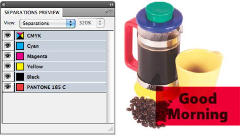 Figure 8. When the spot color Pantone 185 C is added to the document, its name automatically appears in the Separations Preview panel. Here the spot color has been applied to the fill around the words “Good Morning.”