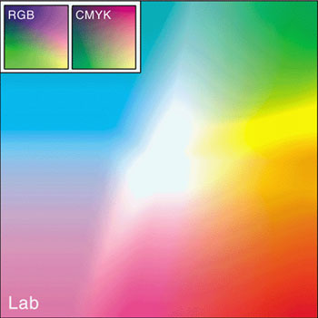 One of the main benefits you’ll notice when working in Lab mode is that you’re provided with a wide range of color values to choose from. Figure C shows the high intensity colors available to you in this mode versus those available in RGB and CMYK. The Lab color model actually includes all of the colors that you can create in both RGB and CMYK modes.