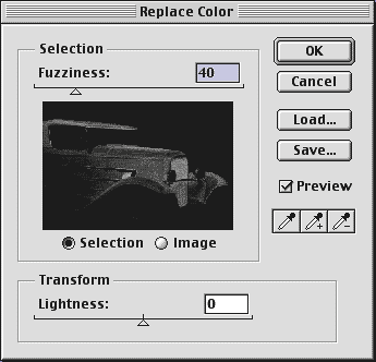 Not only can you invert colors using channels, but you can even replace a color. Open a new image in Photoshop and convert it to Lab mode. Select the a or b channel and then choose Image > Adjust > Replace Color. In the resulting Replace Color dialog box, shown in Figure G, select a color that you want to replace. You can do this by clicking on the preview window with the Eyedropper tool, or by clicking on an area of color directly on your image. Set the Fuzziness slider to 40 and choose the Selection option button. Then drag the Lightness slider back and forth to achieve your desired result. Click OK to apply your changes. Again, select the Lab channel in the Channels palette to see the final results. We selected the b channel and increased the Lightness to +70 to create the effects shown in Figure H.
