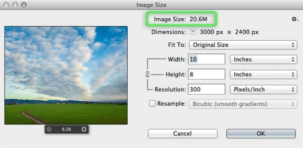 The first place you might see a document size in Photoshop is at the top of the Image > Image Size dialog box. This number tells you how much disk space the document would use it if it was saved as a single layer. If the Resample option is on, you can watch the Image Size number change as you adjust the Width, Height, or Resolution. (If Resample is off, Image Size doesn’t change because the number of pixels remains constant no matter how you change the numbers.)