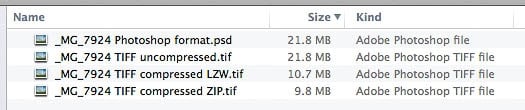 Having seen the various document sizes reported in Photoshop, you might wonder why those sizes don’t match what your Mac or Windows desktop tells you. For example, the document we’ve looked at so far is a basic 8×10-inch photo at 300 pixels per inch (ppi). But even that same photo can take up very different amounts of disk space depending on the file format and file compression you chose, as in the figure below. The first two examples, Photoshop format and TIFF uncompressed, are close to the document size reported inside Photoshop. The rest are smaller. However, while ZIP compressed TIFF may be the smallest, it can take much longer to save changes and may be compatible with fewer applications.