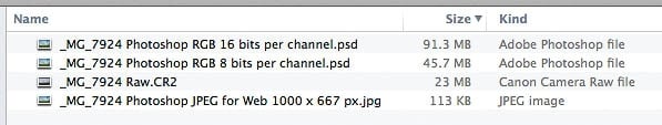 Another factor is bit depth. Many digital cameras capture 12 to 14 bits per channel into that raw file. You can set Camera Raw or Lightroom to open that raw file in Photoshop at 8 bpc or 16 bpc, and that too will affect the document size of the resulting Photoshop file. If you convert a 12 bpc raw file to a 16 bpc RGB Photoshop document, you should expect a large increase in file size. You can then expect a large decrease in file size when you save a final copy of the document with much smaller pixel dimensions, as a single flattened layer, in the lossy JPEG format, for posting on your web site. The next figure shows the possible variation in file size for an image that started as a 5184?×?3456 pixel raw file.