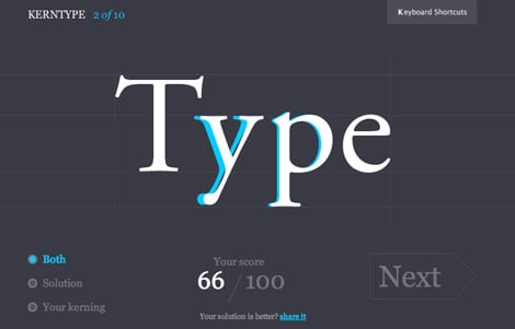 The site offers interactive kerning practice where you drag letters within words to distribute the given amount of space. When you’re finished you can compare your results with those from a professional typographer, and you are awarded a score based on how close you were to matching the pro’s solution. You can also share your solution if you think it is actually better than the pro’s.