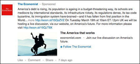 Figure 5: The square logo for the Economist magazine shows up just to the left of one of its updates on LinkedIn’s home page