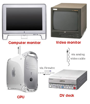 A FireWire-based editing system is configured a little differently than other nonlinear editing systems: the video signal must pass from the CPU through the video deck and then out to the video monitor to get full-size, full-frame-rate playback.