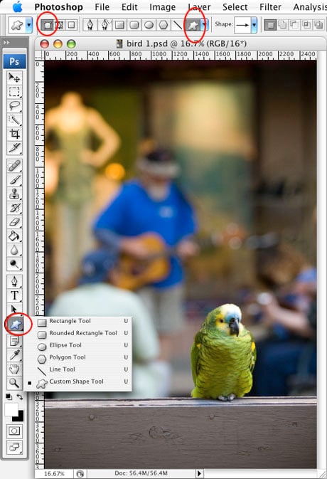 Make sure the tool is in Vector Shape mode, one of the three modes available when you’re working with vector tools in Photoshop. That way, dragging the tool across the image creates a vector shape layer (instead of a path or a selection), which is what we want. Vector Shape mode is the first icon at the far left of the Options bar and looks like a square with points on the corners (Figure 1). Click it if it’s not selected already.