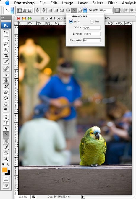 Here’s another way to skin the cat. You may have noticed that one of the vector shape tool variants is the Line tool. It’s the only tool in Photoshop that allows you to add arrowheads at the start or end of it (or both).