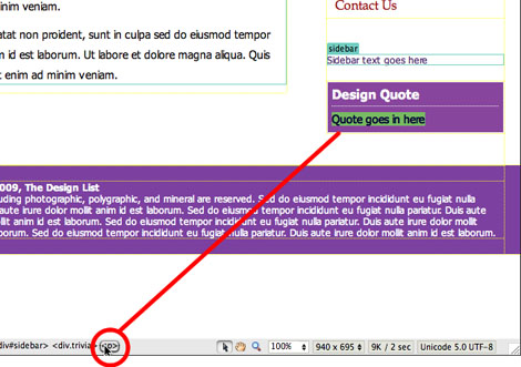 3. Click anywhere inside the purple “Design Quote” box and select Edit > Select All twice (or use the keyboard shortcut Ctrl-A/Command-A). The first “Select All” selects the contents of the box while the second selects the <div> tag (the box itself). (You could also use the tag selector method displayed in Figure 1 to select the div.)