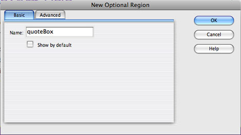 4. Choose Insert > Template Objects > Optional Region. The New Optional Region window appears (Figure 2). Type “quoteBox” in the Name field and make sure the “Show by default” box is not checked. Click the OK button to create a new optional region.