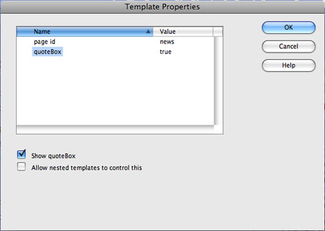 Figure 3. You can hide or show optional regions from the Template Properties window. The “Allow nested templates to control this” box applies only if you use Dreamweaver’s confusing and not that useful “nested template” feature.