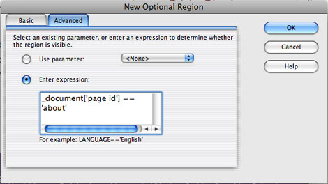 11. Choose Insert > Template Objects > Optional Region. The New Optional Region window appears. Click the Advanced tab. Click the “Enter expression” radio button to select that option. In the text field type _document['page id'] == 'news'. This instruction tells Dreamweaver to display this list on any page with the ID news added to it.