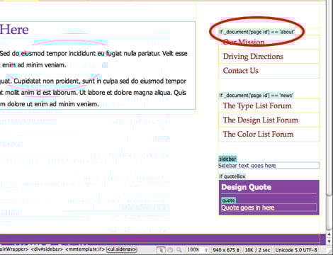 Basically, this equation says that whenever it’s true, the list of links will be shown and whenever it’s false, the links won’t be shown. The _document['page id'] part is related to the editable tag attribute from the last tutorial. As you’ll recall, you made the ID attribute of the <body> tag editable, so that you could apply a different ID to template-based pages. This, with a little creative CSS, made it possible to create custom looking Web pages for each section of the site, while still only using a single template. In the last tutorial, you named the editable tag attribute “page id”. In doing this, you also add what’s called a “template parameter” to the template file — to access that attribute you use the code _document['page id'] that essentially means, “Give me the current name of the ID applied to the <body> tag.” The == 'about' part finishes off the equation, which can be translated to “If the page id is equal to ‘about’ then show this optional region.” In other words, if the ID applied to the <body> tag is about, then this list of links for the “About Us” section should be displayed.