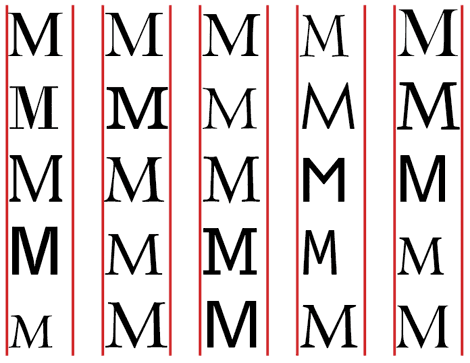 Figure 1. Not all Ms are created equal, or equally wide. The red lines indicate the full width of an em for each column of characters.
