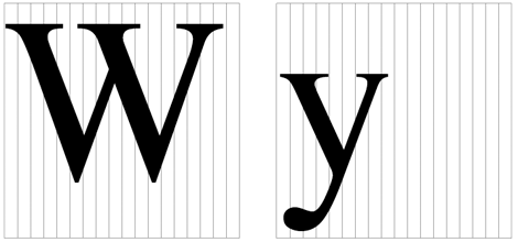 Figure 2. Typefaces created for the Monotype composing machine were designed with character widths expressed in increments of one eighteenth of an em. Below are two characters superimposed on an 18-unit wide em square. This shows that in the Monotype system, the W was 17 units wide and the y, 9 units wide.