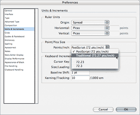 Figure 5. In the InDesign Units & Measurements preferences dialog box, you can easily choose between PostScript points and traditional American points.