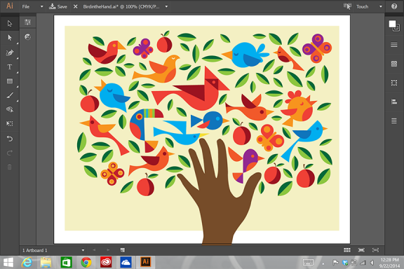 The Touch Align panel does away with the confusing icons from the desktop version and creates a dynamic grid that illustrates what will happen to the selected items when aligning. One of my favorite Illustrator tools is the Shape Builder, which gives you many of the same options as the Pathfinder, but in a very visual way. The Shape Builder tool in the touch workspace does this same work at an even faster pace. As Michael Ninness showed off the feature using the Adobe Ink stylus, he dubbed the feature “Pathfinder on a Stick.” Trademark that, Michael! Combining or deleting overlapping shapes and getting rid of unwanted elements is so easy and intuitive with the touch Shape Builder tool that I might not have to call myself an Illustrator hack anymore.