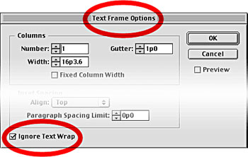 Fortunately, Adobe has a solution for this situation. Select the frame than holds the text that you don’t want to have affected by a text wrap setting. Choose Object> Text Frame Options. Inside the dialog box, check the option to Ignore Text Wrap (figure 7)